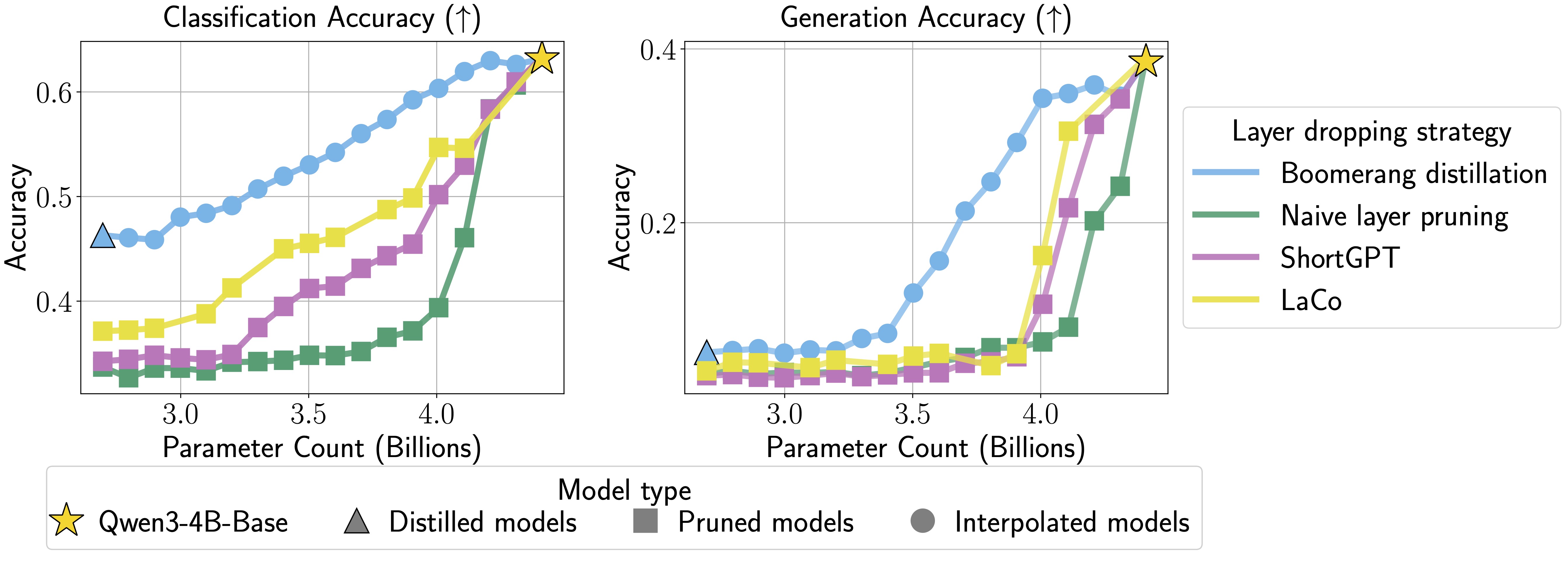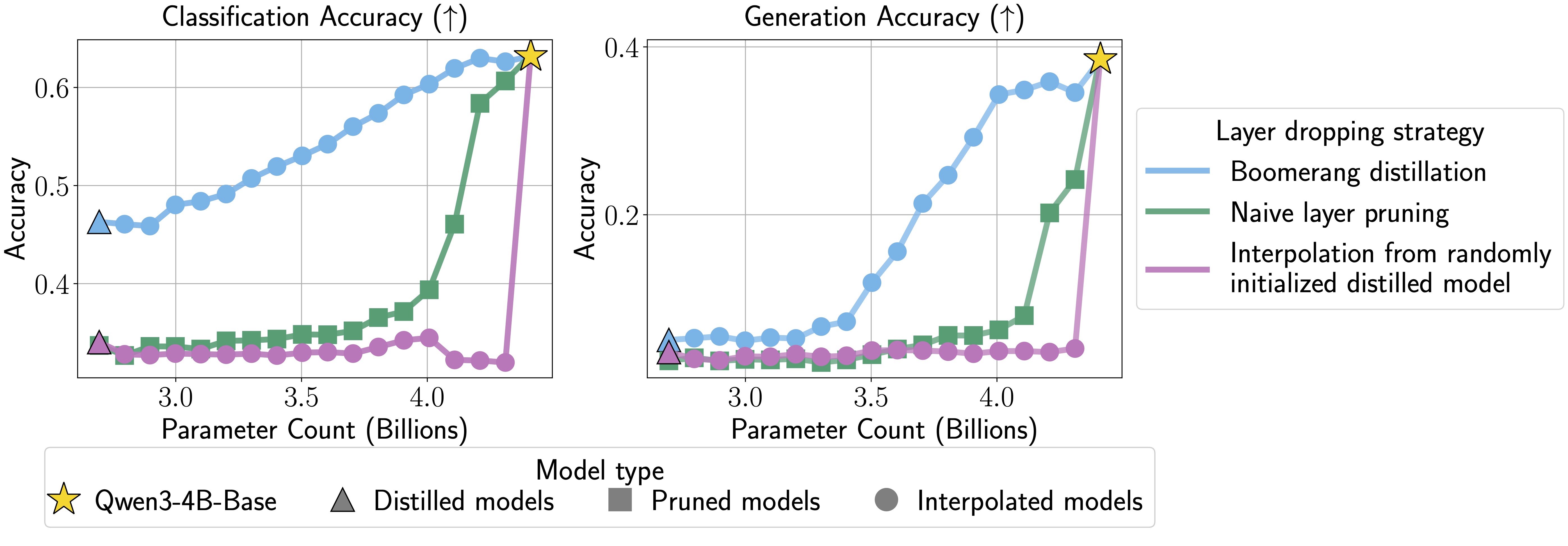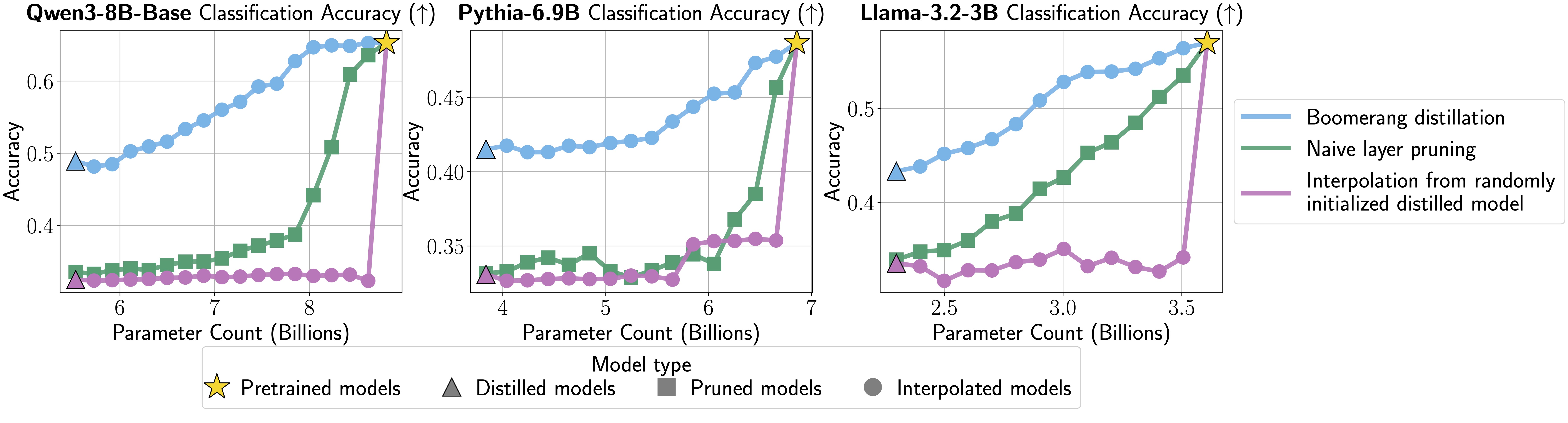 We find that across multiple model families and sizes, boomerang distillation creates intermediate models whose performance interpolates smoothly between the student and teacher (Figures 3 and 4). In contrast, both baselines’ performance sharply decreases with model size. This shows that both ingredients – the right initialization and knowledge distillation – matter. Leave out either step and the boomerang effect largely disappears.