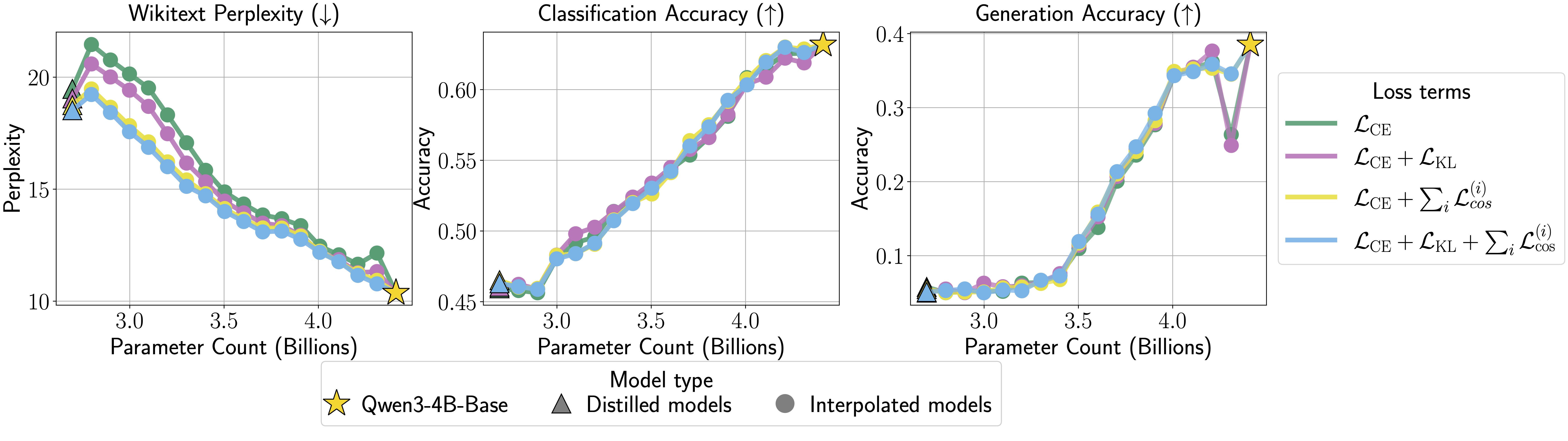 We also test which parts of the distillation objective are needed for boomerang distillation. To do so, we train four students with ablated loss terms and then interpolate from them. In Figure 5, we find that for most model sizes, leaving out the per-layer cosine distance (the green and purple lines) does not meaningfully reduce interpolation performance. This suggests that the initialization in Step 1 already provides enough alignment for boomerang distillation to work reasonably well without explicitly training every intermediate layer to match the teacher. That said, students distilled with the per-layer cosine term show more stable interpolation than those without. Looking ahead, we are interested in understanding whether we can keep that stability without explicit layer-wise alignment during distillation, because removing the need to keep the teacher in memory would significantly reduce the GPU footprint of training the student.