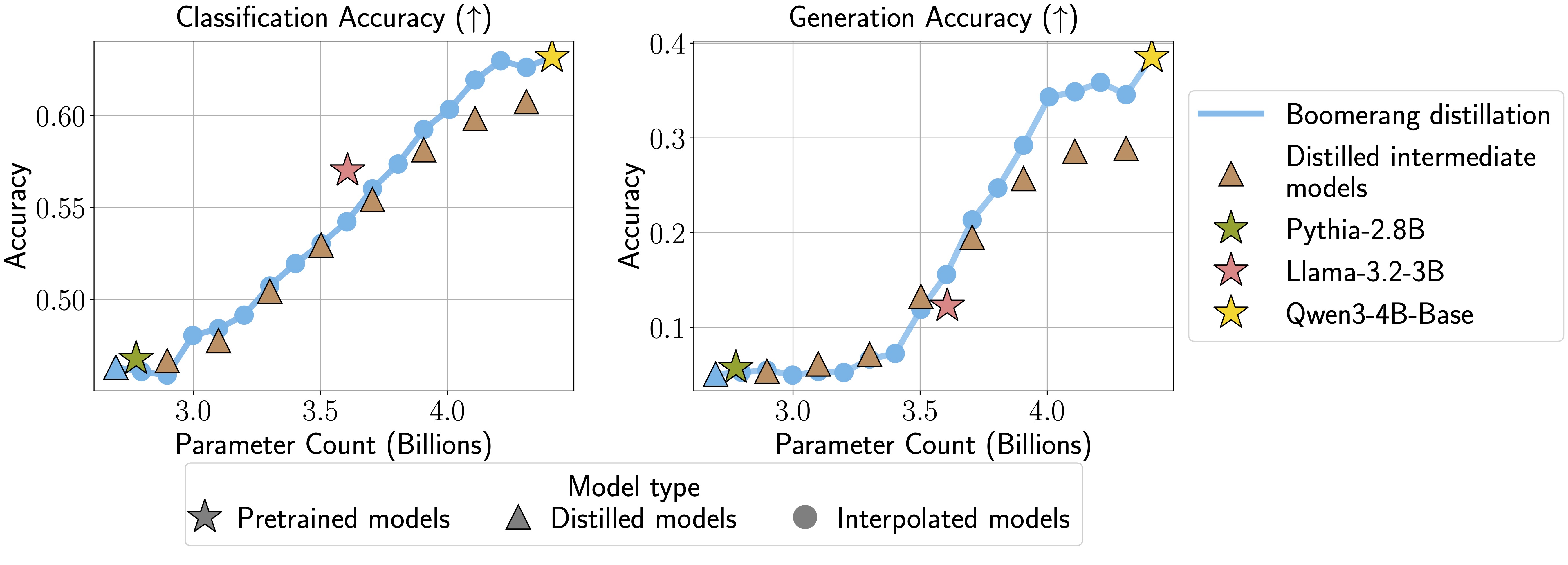 Given the limitations of current approaches, how can we efficiently create models of different sizes? We show that surprisingly, distillation is not just useful for training good student models – with the right setup, we can mix and match parts of the teacher and student models to build intermediate models that smoothly trade off size and performance! We call this phenomenon boomerang distillation: starting with a large teacher, we distill a single smaller student, and then “boomerang” back toward the teacher by selectively swapping in teacher components, creating many models of intermediate size without any additional training.