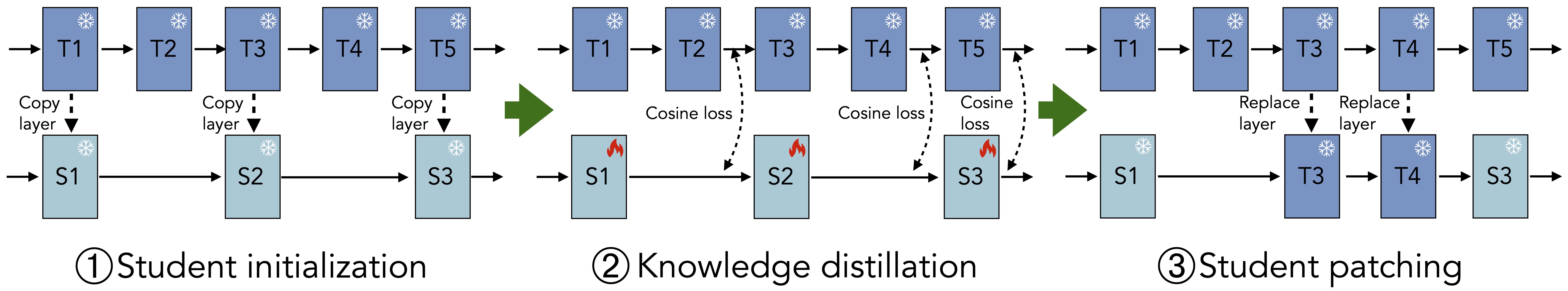 Boomerang distillation consists of three key steps: (1) student initialization, (2) knowledge distillation, and (3) student patching (Figure 2). We explain each of these steps in detail below.